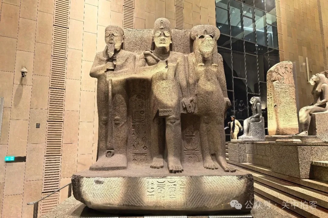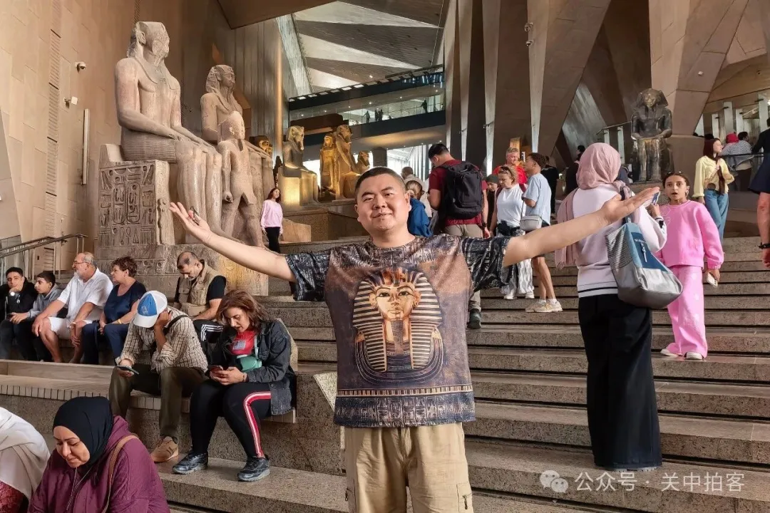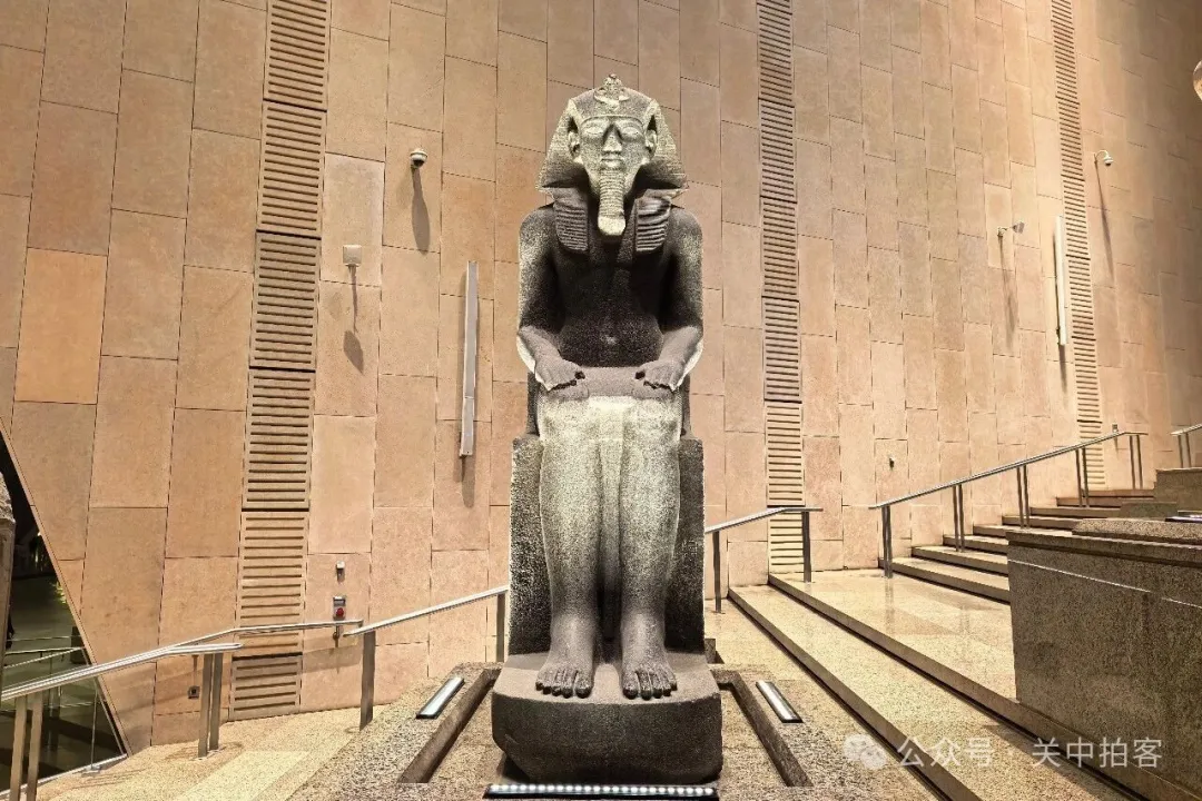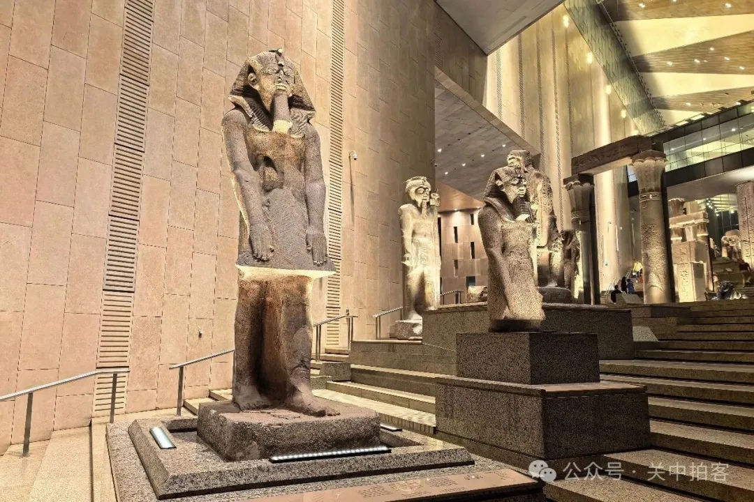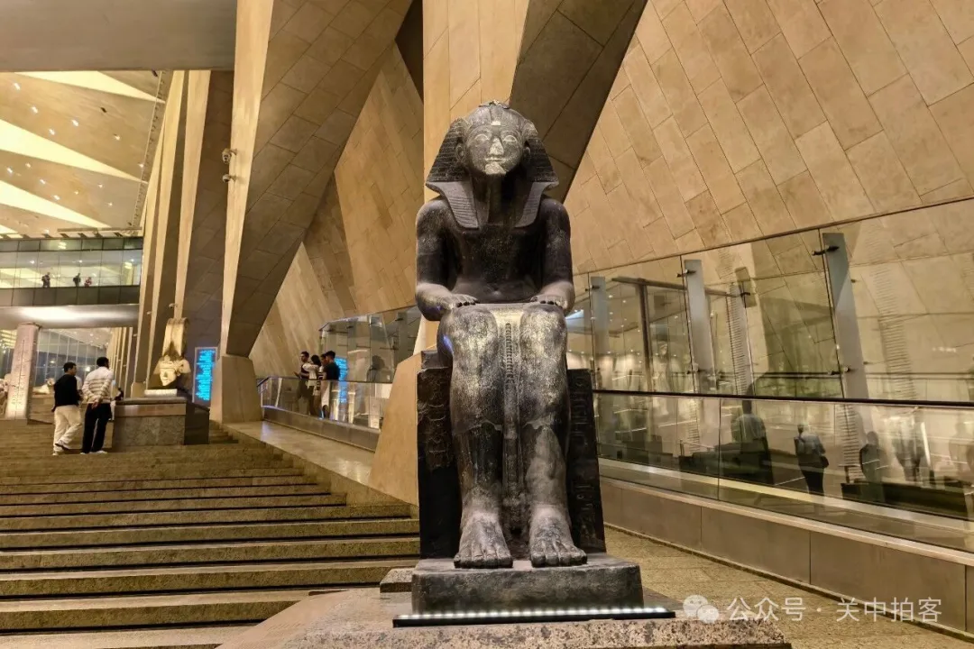 2025年11月22日上午,我来到大埃及博物馆,大楼梯上的人特别多,便先参观上方的展厅。夜晚,临近闭馆的时候,大楼梯上的人明显少了!于是,我乘坐电梯到达大楼梯顶端,再自上而下欣赏每一件石刻,包括59件大型雕像、碑刻、立柱、棺椁等。