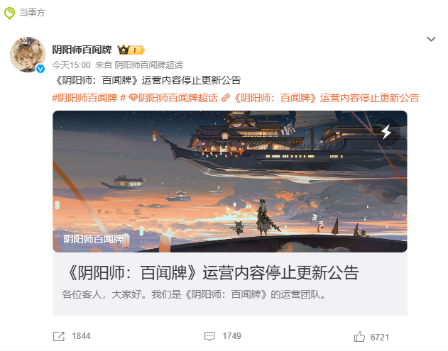 同时,《阴阳师:百闻牌》官方感谢玩家长久以来的陪伴,并为运营内容停更这一消息深感抱歉。