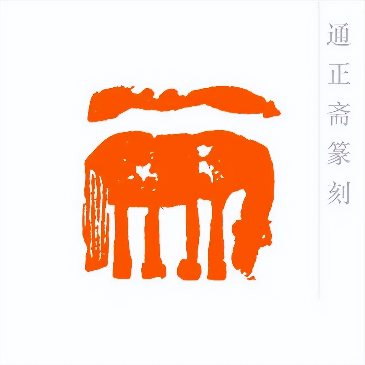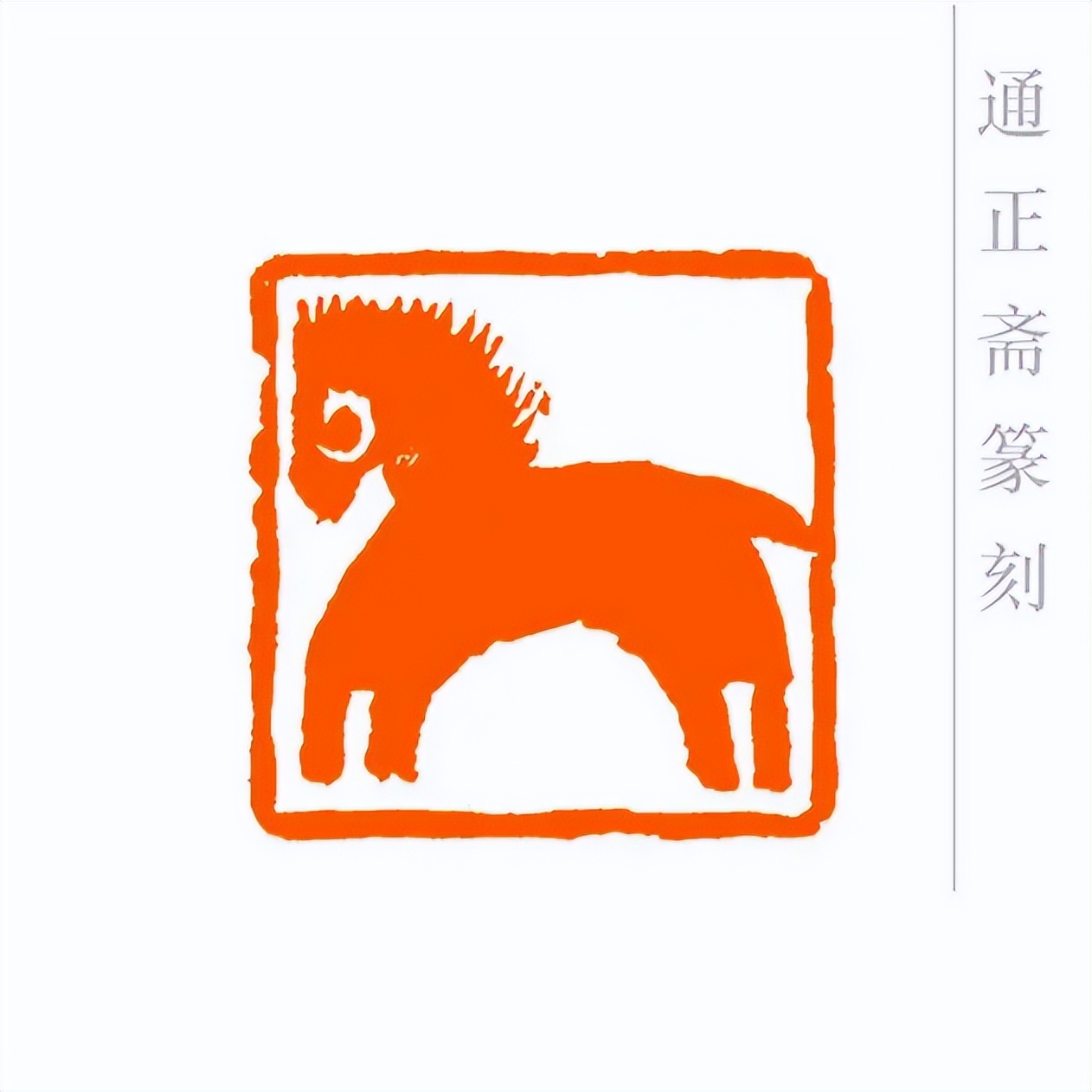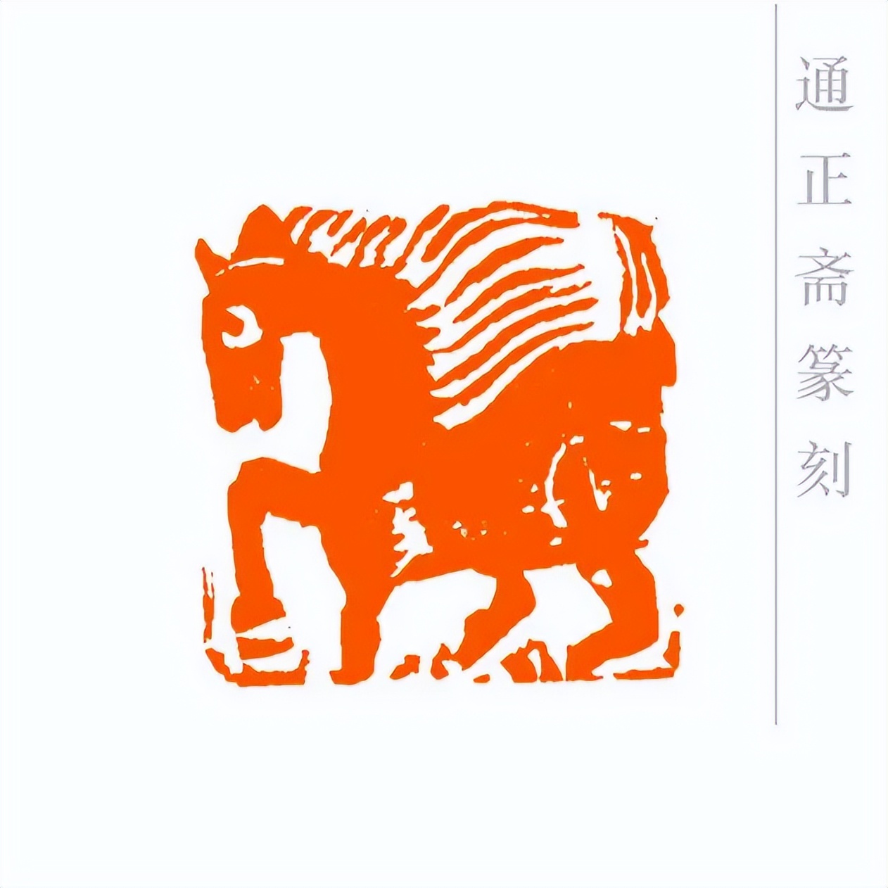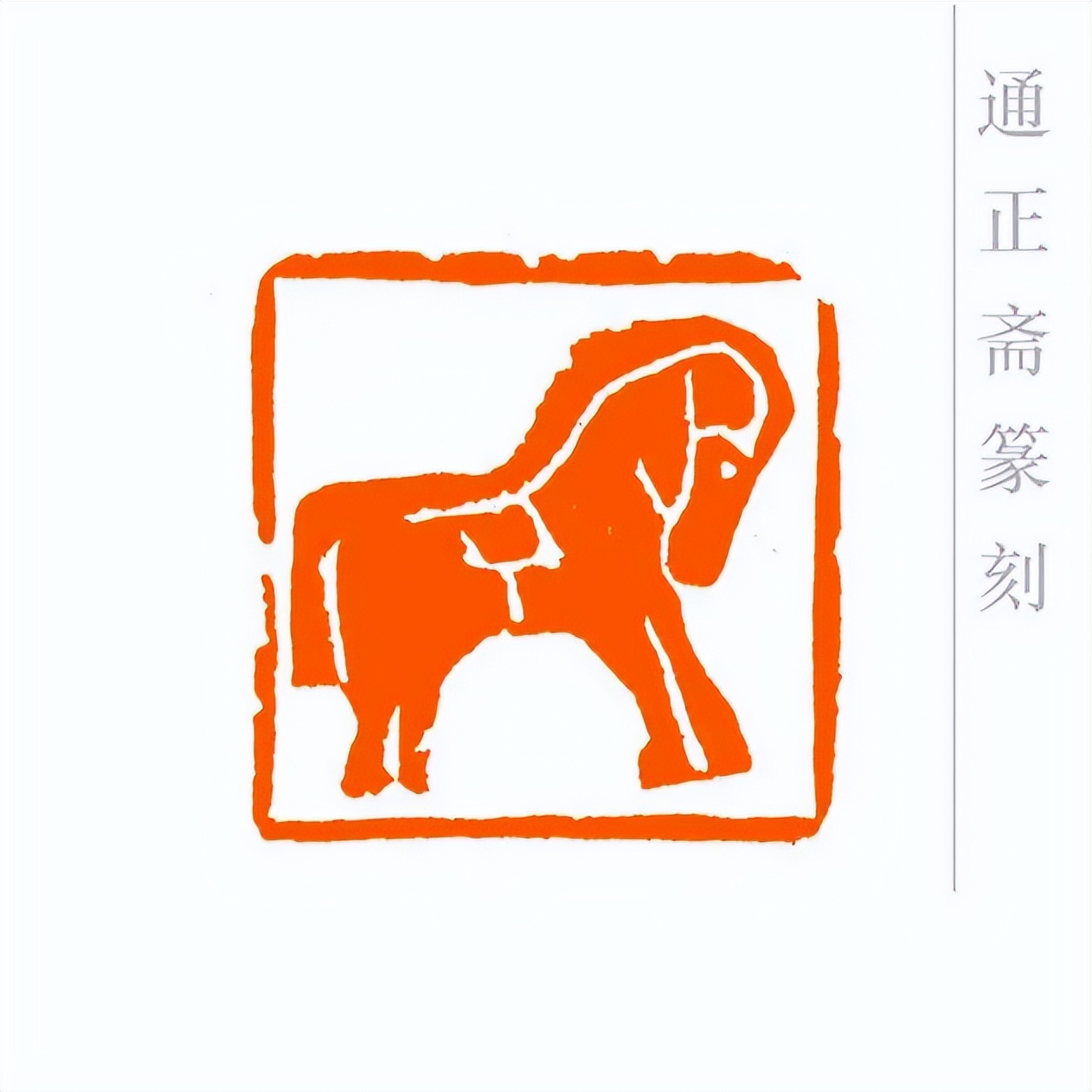 通正斋刀下的肖形马印章,首推造型之妙,篆刻家摒弃繁复装饰,追求线条的凝练与姿态的灵动。印章中的马,或昂首嘶鸣,四肢矫健如蓄势待发,锐气昂扬;或踏风奔跃,躯干线条流畅舒展,气魄豪迈。马的轮廓以简约刀法勾勒,既保留了骏马的写实神韵——鬃毛的飘逸、肌肉的张力、身姿的挺拔,都栩栩如生,又通过艺术化的概括,让造型更贴合印章格局,避免了因细节堆砌而显得臃肿。这种形简神足的设计,让观者一眼便能感受到马的奔放与力量,尽显肖形印以小见大的艺术魅力。