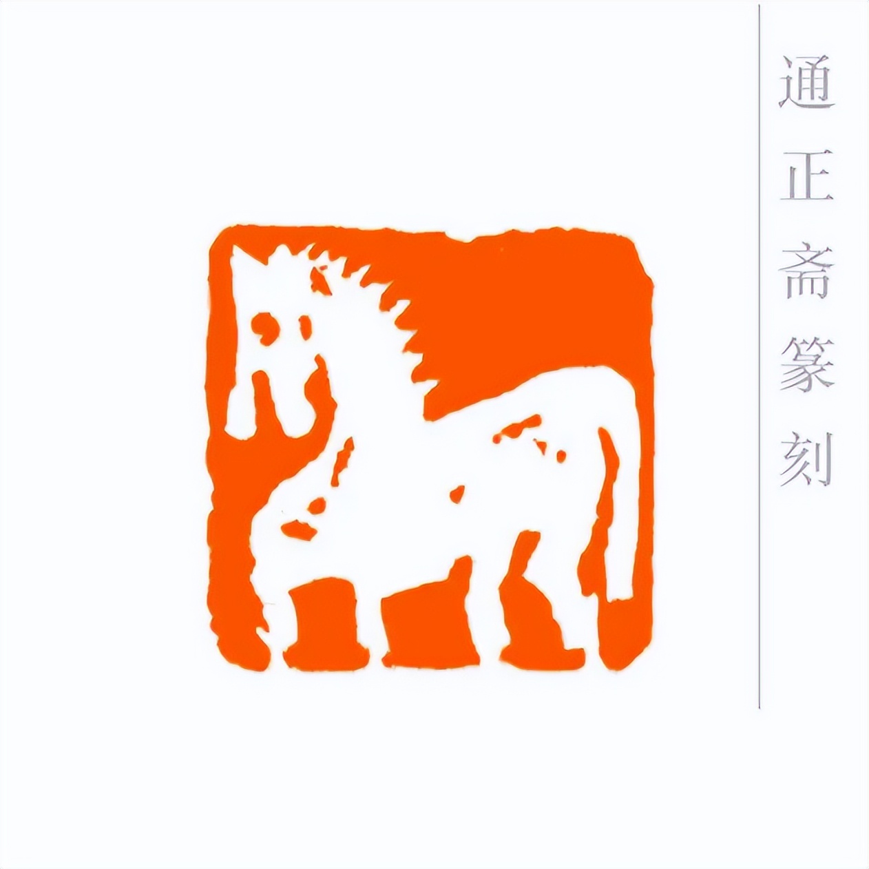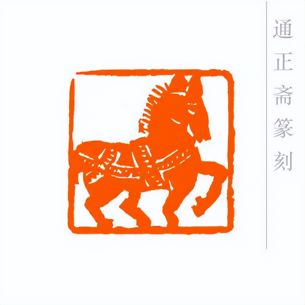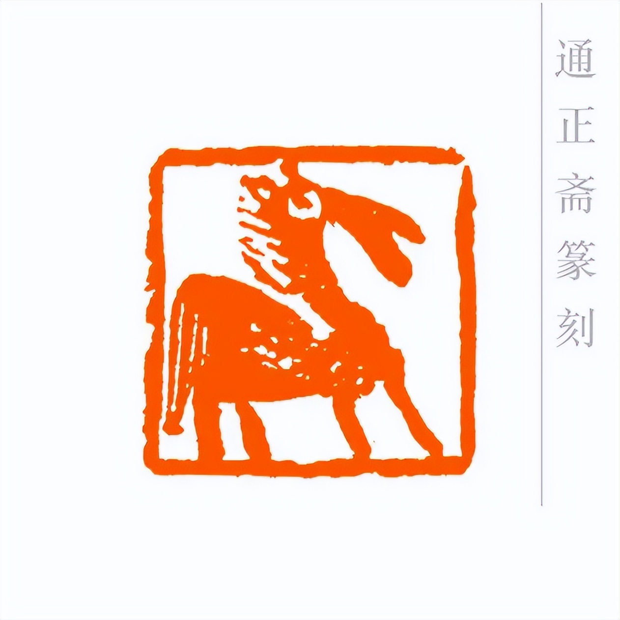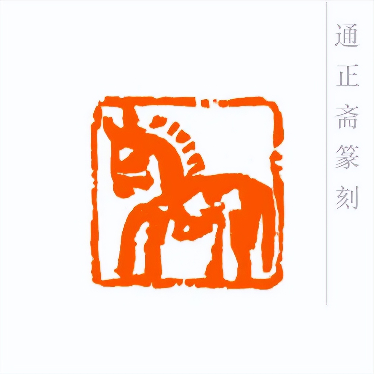 通正斋刀下的肖形马印章,首推造型之妙,篆刻家摒弃繁复装饰,追求线条的凝练与姿态的灵动。印章中的马,或昂首嘶鸣,四肢矫健如蓄势待发,锐气昂扬;或踏风奔跃,躯干线条流畅舒展,气魄豪迈。马的轮廓以简约刀法勾勒,既保留了骏马的写实神韵——鬃毛的飘逸、肌肉的张力、身姿的挺拔,都栩栩如生,又通过艺术化的概括,让造型更贴合印章格局,避免了因细节堆砌而显得臃肿。这种形简神足的设计,让观者一眼便能感受到马的奔放与力量,尽显肖形印以小见大的艺术魅力。