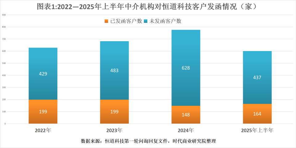 第一轮问询回复文件显示,报告期各期,中介机构对恒道科技客户发函数量的比例分别为31.69%、29.18%、19.07%、27.29%。其中,对销售额50万元以下客户发函数量比例分别为21.95%、19.30%、5.72%、17.80%。从数量上看,报告期各期,未收到函的客户数量分别为429家、483家、628家、437家,其中,销售额50万元以下客户未收到函的数量分别为427家、481家、626家、434家。