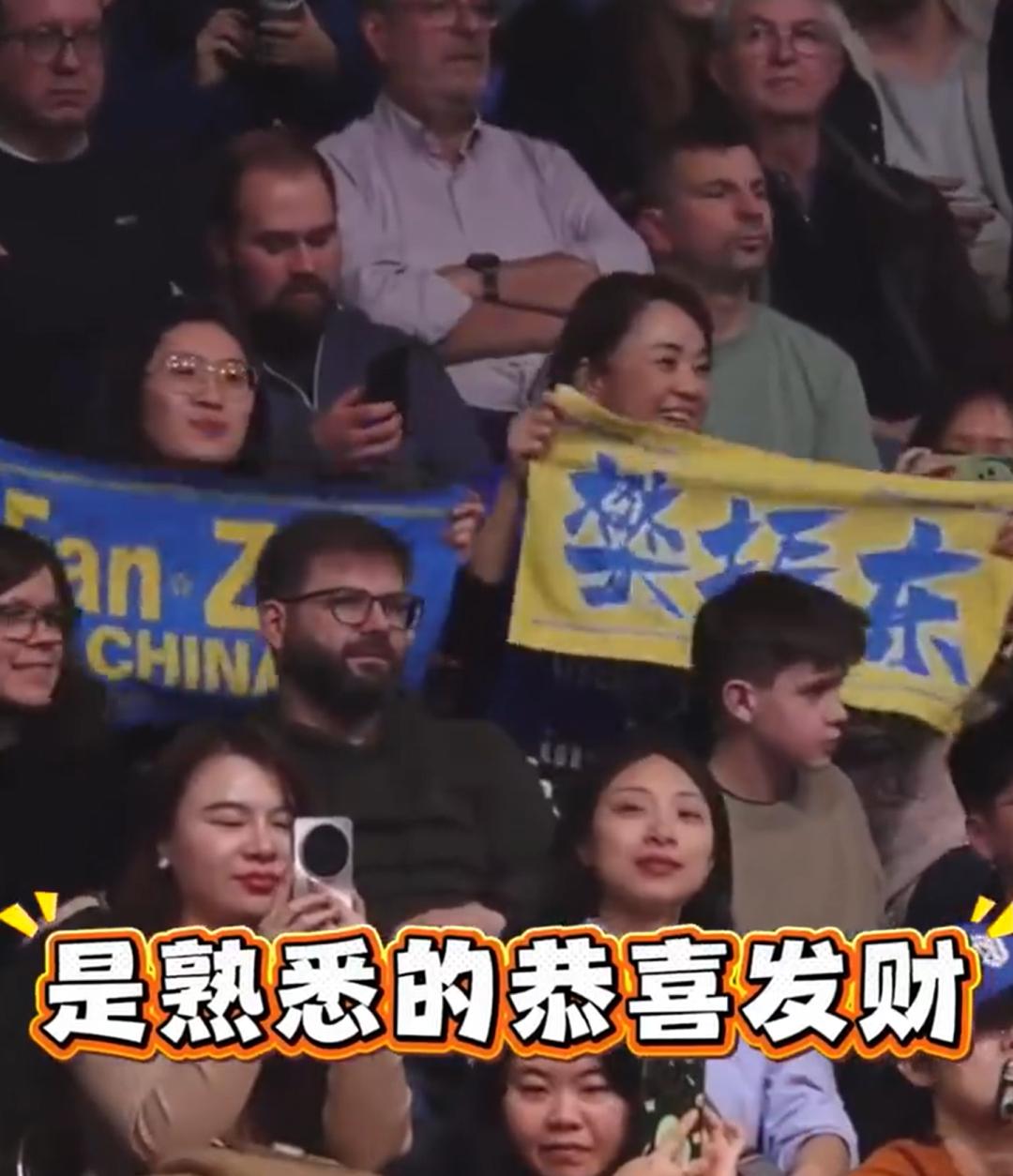 此外,在樊振东对阵西蒙高茨局间休息,现场 突然响起 《恭喜发财》的BGM(背景音乐) ,观众举着福字跟着旋律摇摆,中国年味直接飘满欧洲赛场。