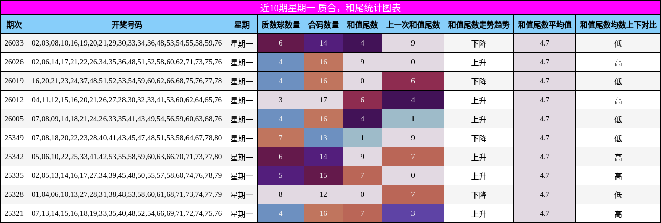 下图展示了近10期星期一的质合与和尾走势。可以看出,合数在多数周期中保持高位运行,质数则长期处于低位徘徊。这种结构性失衡往往预示着趋势的潜在转折。本期质数推荐号码为01,41,47,均来自质数集中区(1-50),且01为最小质数,具备回补动能,41与47则处于近期质数断档区,具备反弹潜力。