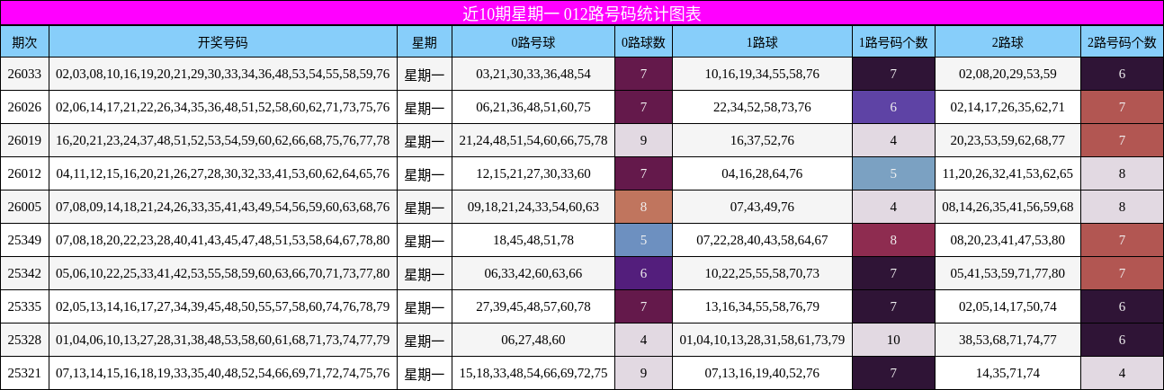 下图显示了近10期012路号码的分布情况。0路在近期多次出现低频,但其长期平均值稳定,具备“补涨”基础。本期0路推荐数量达7个,高于1路和2路的预期(各7个),形成“0路主导”的格局。其中,06,09,12,24,27,30,48均为0路中段与后段号码,分布合理,覆盖全面。