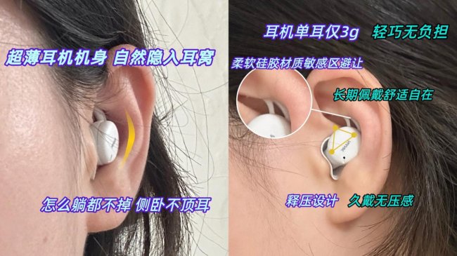 南卡DeepSleep真正实现了无感佩戴的舒适体验!单耳仅重约3克,采用创新的4mm超薄声学模组,厚度比硬币薄约40%,侧卧或翻身时完全不会压迫枕头。其NanoSoft亲肤涂层与ZPP三点压力分散结构,能有效分散耳道压力与摩擦感,整夜佩戴不闷热、不胀痛,亦不易脱落。更配备智能AirSkin微气流通道,通过隐藏式导气设计平衡内外气压,彻底告别堵塞感,确保睡眠中双耳依然自在呼吸。即便长时间使用,舒适度依旧稳定在线,犹如为耳朵营造了一个轻柔的私人静音空间!