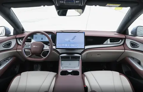 坐进车内,内饰延续了海洋美学设计,用了纹理喷漆、针织布等多种材料,摸起来质感不错,不会有廉价感。内饰有美态香红和流光灰两种配色,能满足不同审美需求。配置上,15.6 英寸悬浮 Pad、10.25 英寸全液晶仪表,再加上虚拟屏幕和 2 英寸 W-HUD 抬头显示,屏幕组合很丰富,开车时看信息也方便。车机系统是 DiLink 100,支持全场景智能语音、手车互联和 One ID 账号体系,我体验了下语音控制,响应速度还可以,能精准控制空调、导航这些功能,日常使用挺便捷,而且 UI 布局比老款优化了,操作起来更流畅。