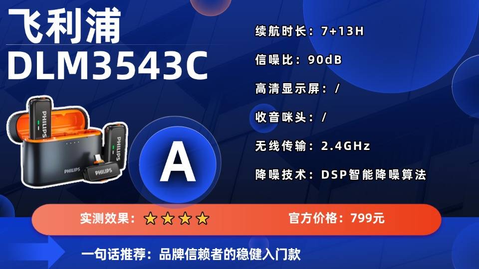飞利浦DLM3543C是一款定位中高端的无线麦克风系统,其核心搭载了DSP智能降噪算法,能够有效识别并过滤环境中的常见噪音,确保人声收音清晰。它采用360°全指向性收音,配合高品质咪头,能均匀收录周围声音,适合单人讲解或小范围访谈。无线连接基于稳定的2.4GHz频段,提供长达200米的有效传输距离,保障了户外拍摄时的创作自由度。整套系统支持一拖二配置,总续航达20小时(发射器7小时+充电仓13小时)。机身轻至15克,佩戴舒适。不过,参数表中未明确其信噪比与最大声压级等关键音频性能指标,在精确的音质评估上留有悬念。