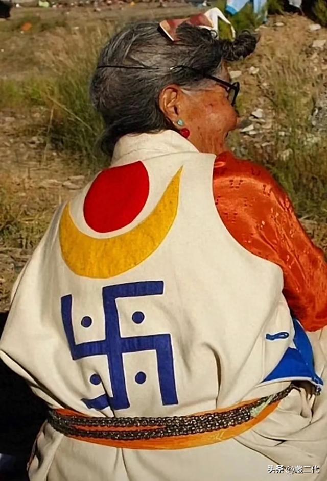 在西藏有个传统,80岁以上的老者,家人们都会在他们衣服的后背绣上红太阳、黄弯月的图案,寓意日月同辉,象征着健康长寿和永恒的福气。