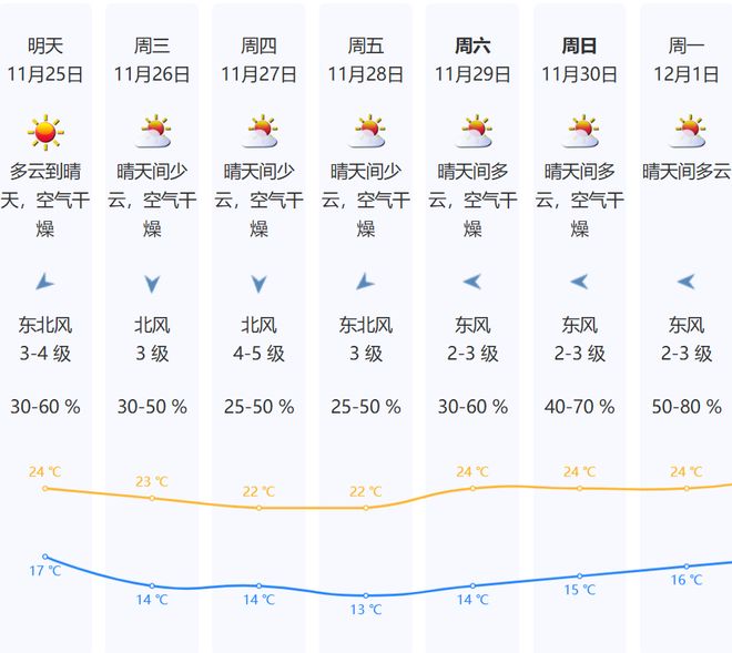 预计25-28日受陆续南下的冷空气影响,晴天干燥为主,最低气温降至13℃左右,其中25日多云到晴天,东北风沿海海区和高地最大阵风7-8级,气温17-24℃。
