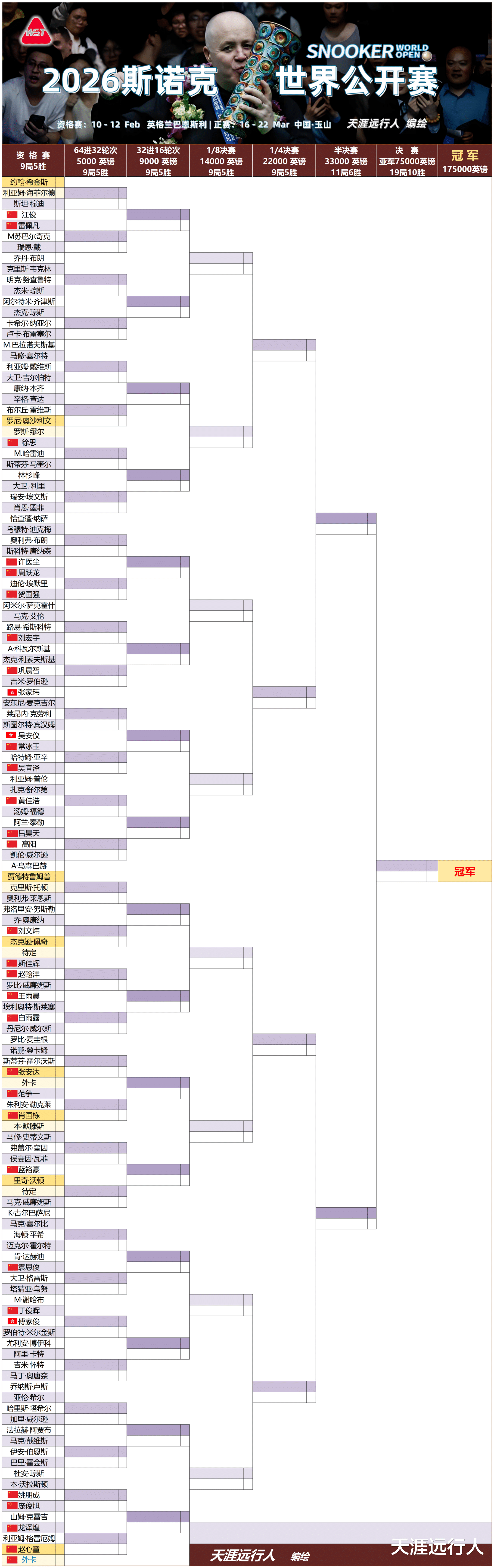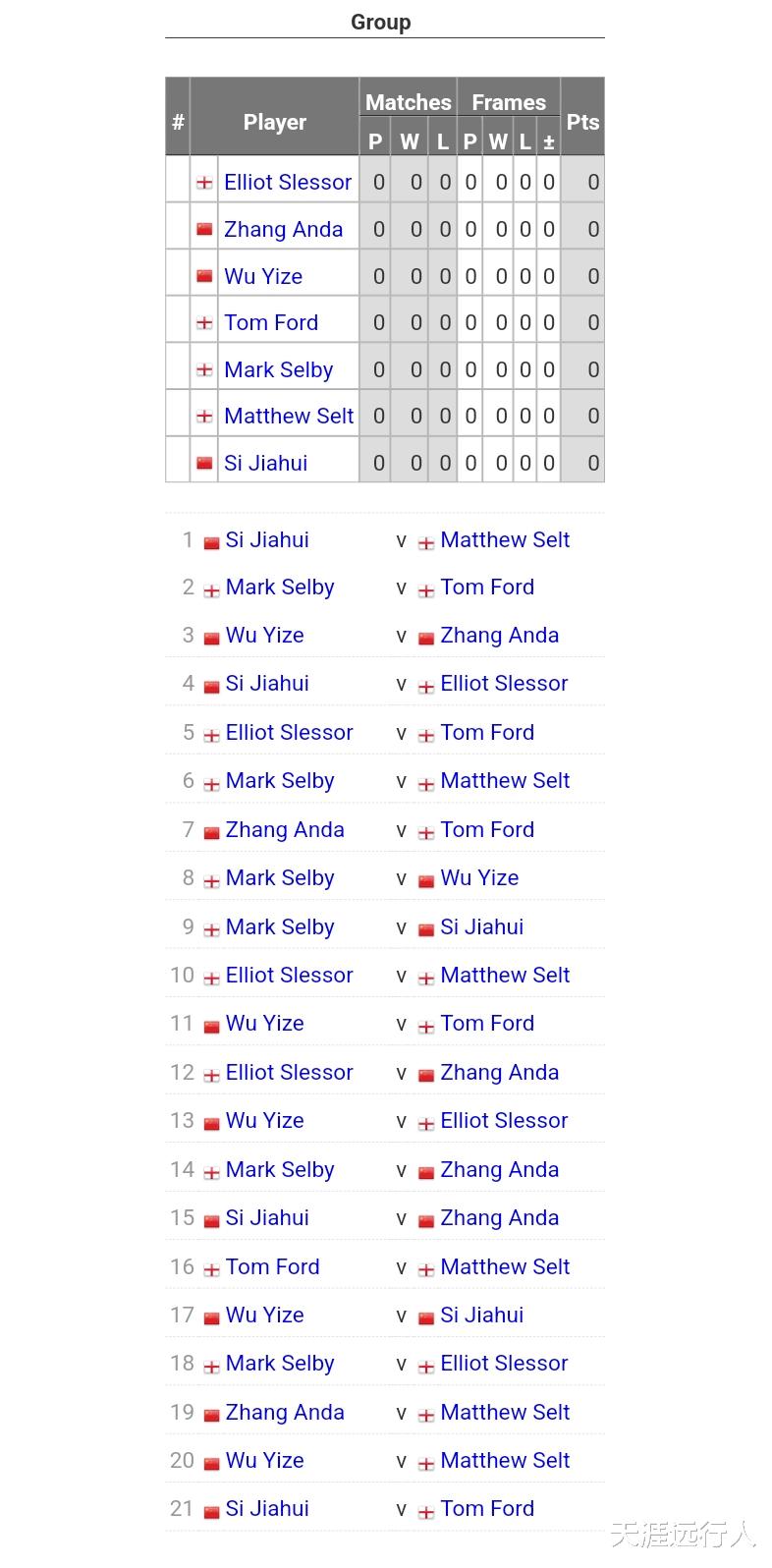 中国军团32位职业球员,除曹宇鹏依然没有现身签表外,悉数报名了世界公开赛;入围冠军联赛胜者组的吴宜泽和斯佳辉的比赛被安排在资格赛阶段的最后一天;还有一个让人浮想联翩的事情,丁主任的资格赛没有被安排到正赛阶段,非常的不正常。