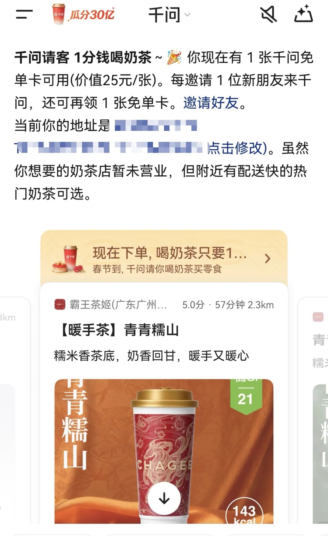 今天的朋友圈被阿里千问“霸屏”了。打开APP就能白拿一张25元无门槛免单卡,不仅能免单喝奶茶,还能通过淘宝闪购买年货、点外卖。