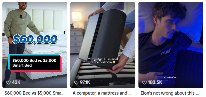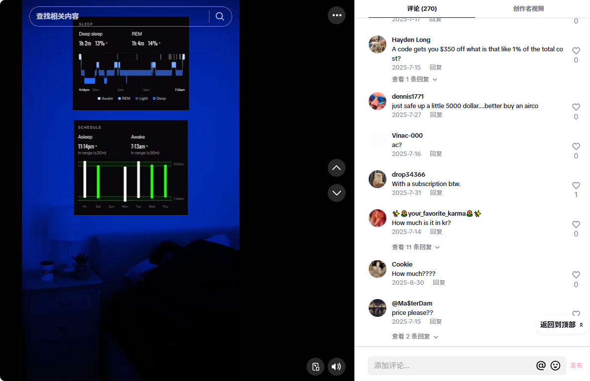 这种“非广告式”的内容,恰好契合了TikTok用户对真实体验的偏好,尤其对一款均价在4000–6000美元的产品来说,真实的睡眠改善案例比硬广更有说服力。