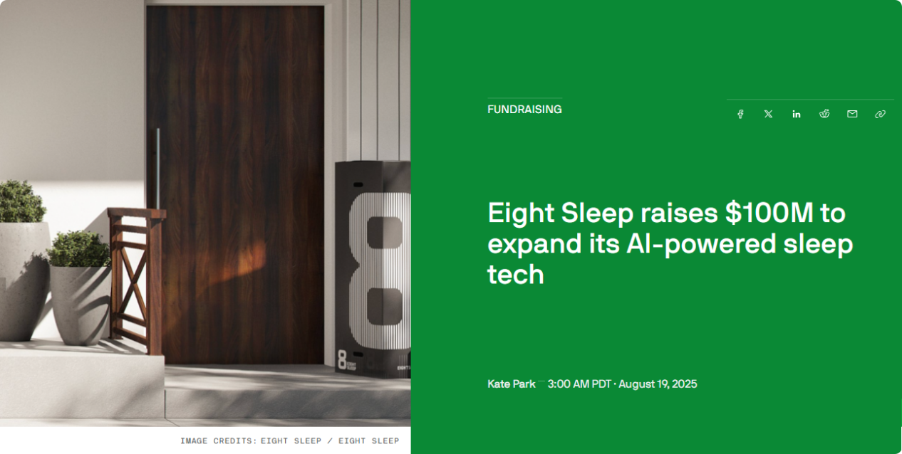 高光时刻在2025年8月到来,Eight Sleep宣布完成1亿美元D轮融资。此轮融资后,公司估值已接近10亿美元,跻身准独角兽行列。