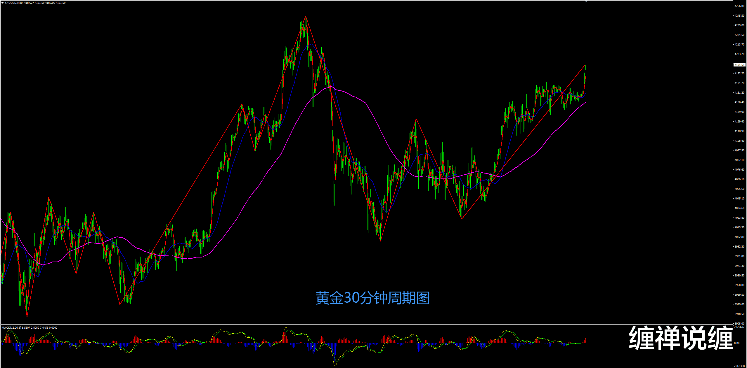 黄金30分钟向上突破上涨延续,黄金短线如果不再跌破4150,那么黄金30分钟整体还是继续偏强势,那么继续延续上涨的概率比较大,黄金短线回撤关注4155附近支撑可以继续顺势多,黄金30分钟上涨有望延续。黄金短线多头依然强势,短线回撤顺势继续多!