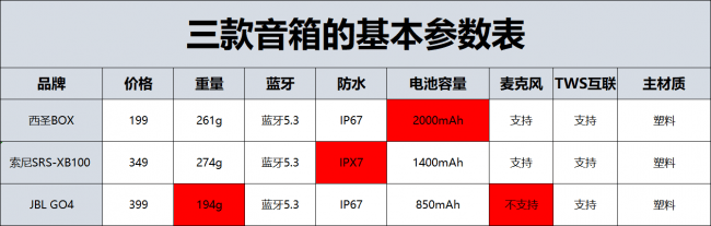 以下是小编整理的三款音箱的一些基本参数,方便大家能够快速了解三款音箱的大致情况:二、蓝牙音箱多维度横向对比 维度一、音质测试对比