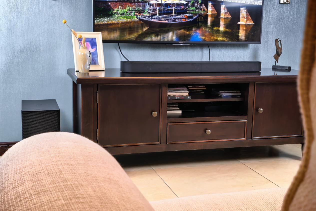 如果家里索尼电视机是座放,并且电视机的支架间距比Bar短,可以给Bar装上支脚,让机身比电视支架高,这样就能正常摆放了。