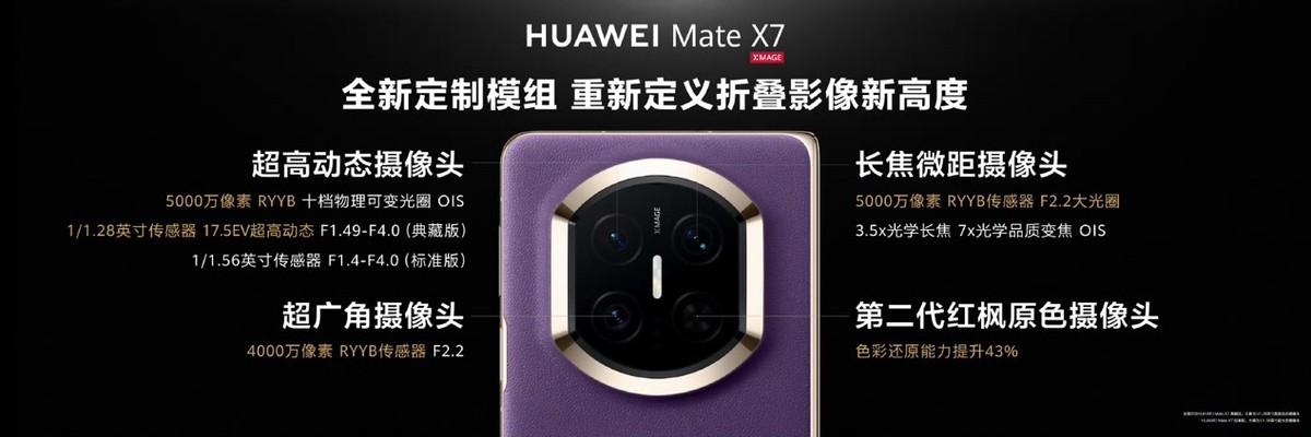 硬件上,华为直接给Mate X7塞进了第二代红枫影像系统。主摄5000万像素+可变光圈,潜望长焦支持3.5倍光学变焦,超广角也有4000万像素,再加上一颗第二代红枫原色摄像头,比很多影像旗舰的“大杯”都要强。