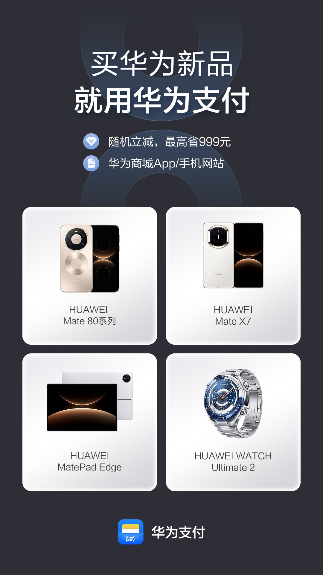 想冲华为新品的宝子看过来!不管是折叠屏王者 Mate X7、性能旗舰 Mate 80 系列,还是 MatePad Edge 平板、WATCH Ultimate 2 手表,直接锁定华为商城准没错!付款时使用华为支付,可享受随机立减优惠,最高能省999元。如果你手里有工商银行、华夏银行、浦发银行的信用卡,还有专属的满减优惠,具体优惠多少金额在收银台直接显示。当然等新机 / 新设备上手后,也别忘了上鸿蒙有礼打卡领红包和权益,这波 “省省攻略” 直接拉满,花更少的钱把新品抱回家不香吗?