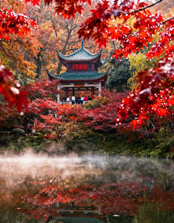 从湖南大学红楼后的登山道起步,岳麓山的秋意便扑面而来。枫香与鸡爪槭交织成火焰隧道,阳光穿透叶片时,脉络清晰如血管图。行至半山,爱晚亭的飞檐从红叶间探出——这座原名“红叶亭”的建筑经袁枚提议改名,取自杜牧“停车坐爱枫林晚”诗意。但此刻环绕它的不止诗情,更有历史的沉重呼吸。