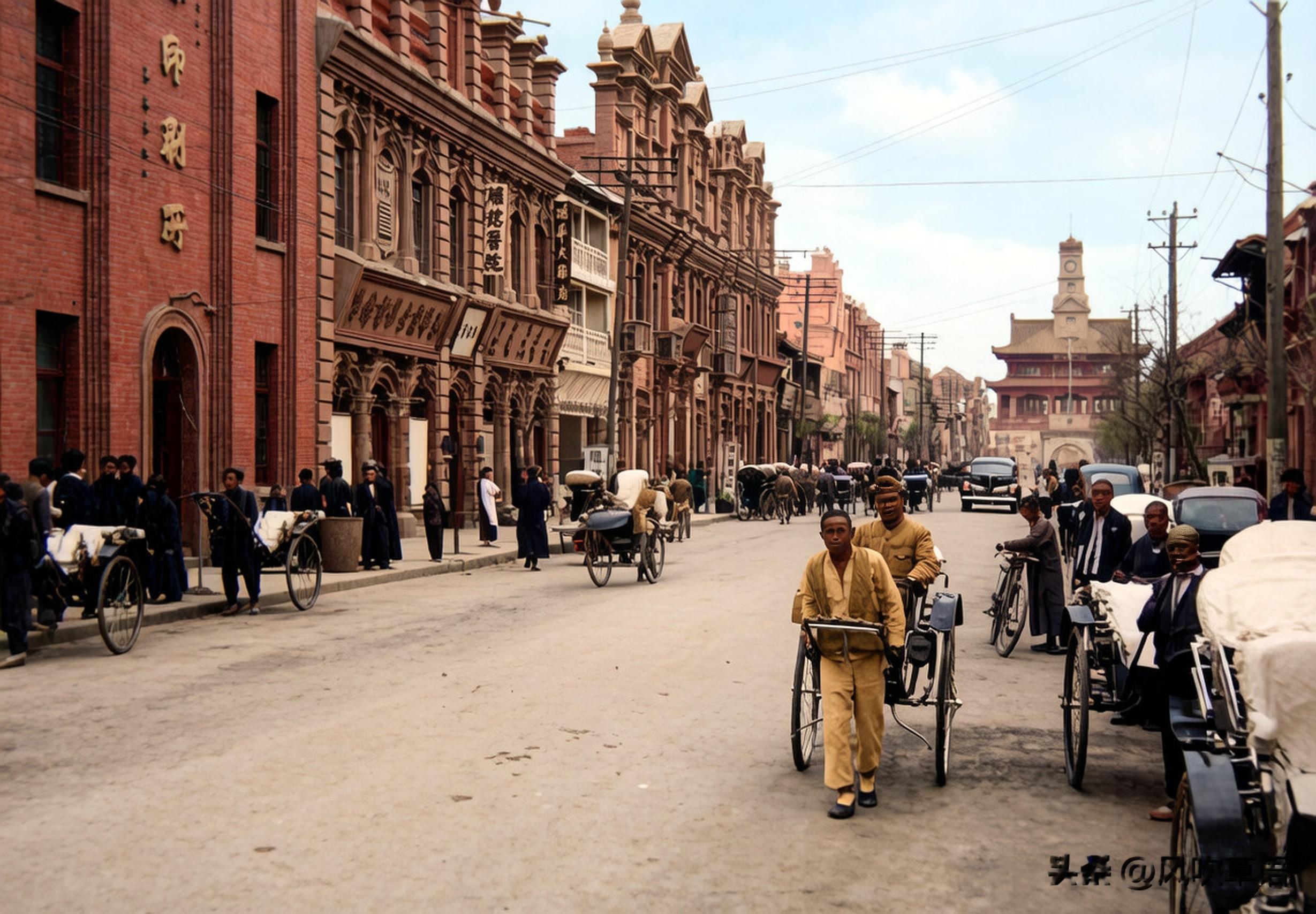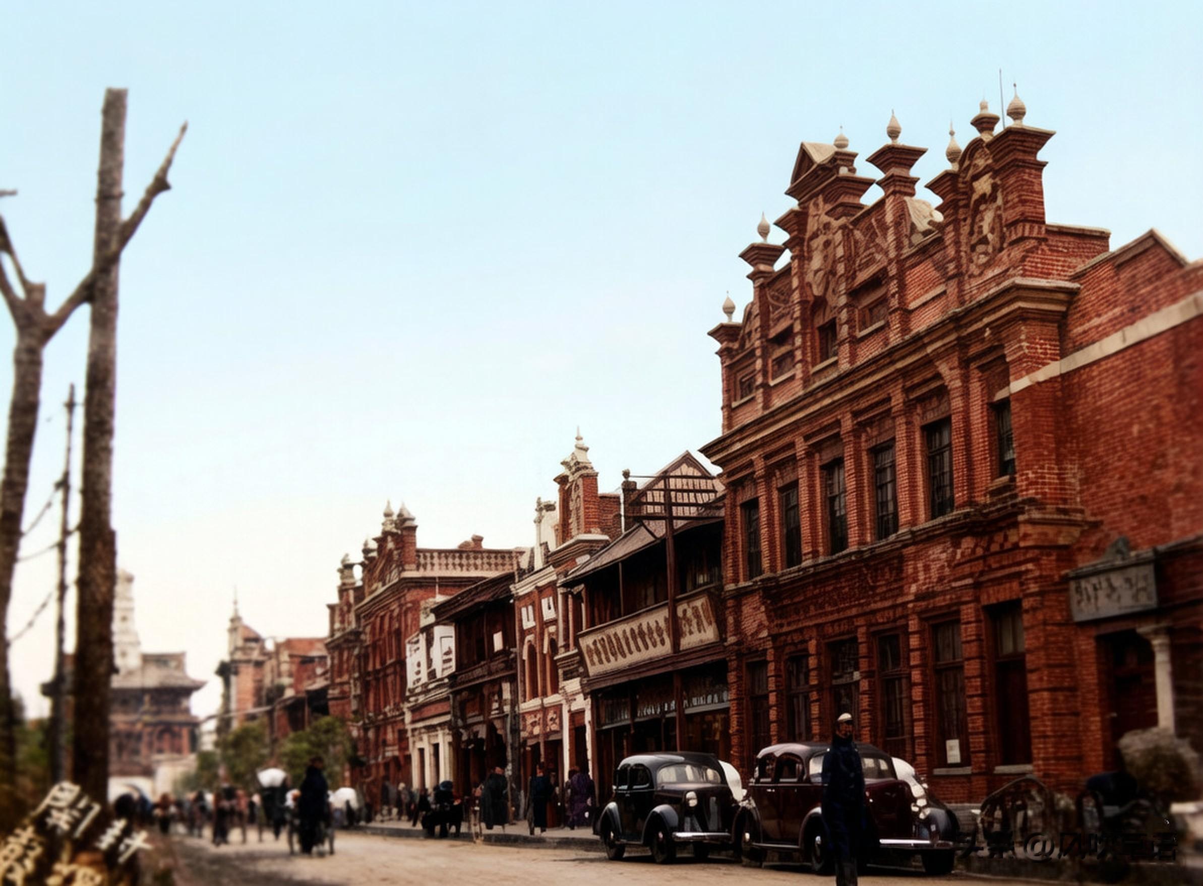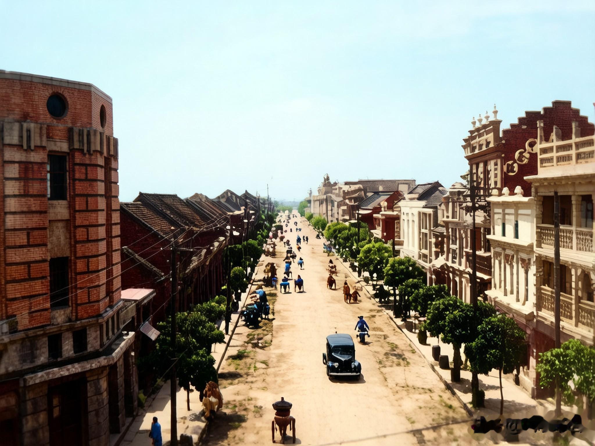 开封城内的一条主街道,两边矗立着高大的商铺,商铺门前种植有两排树木。路面修建的非常规整,马路上,可见穿梭往来的汽车、手推车和人力车。