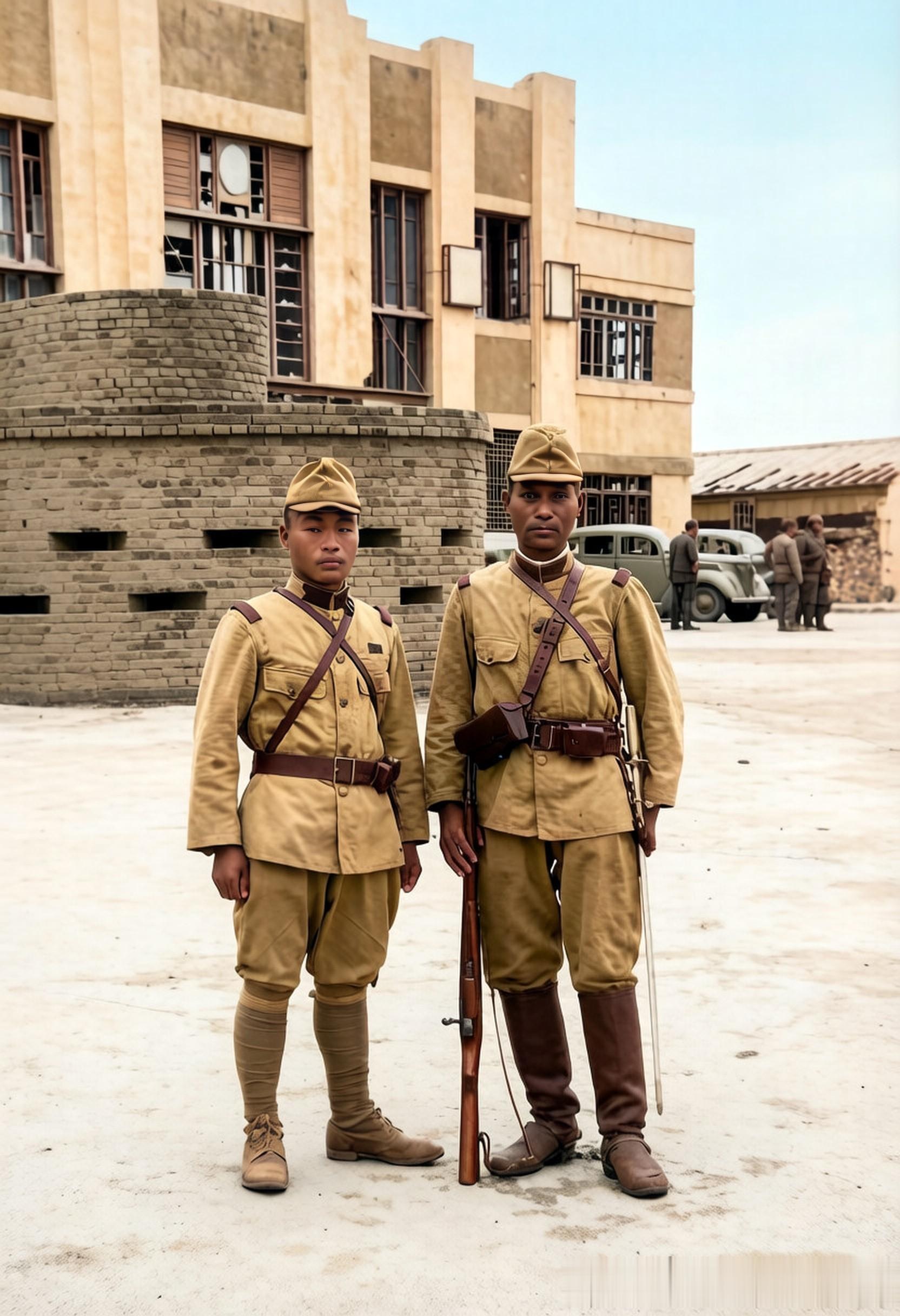 站在开封火车站门前广场上的两个日本兵,身后是一座带有密集射孔的圆形碉堡。候车室门前停放着两辆小轿车。开封火车站始建于1909年,虽然不是西式建筑,但更接近于现代风格。