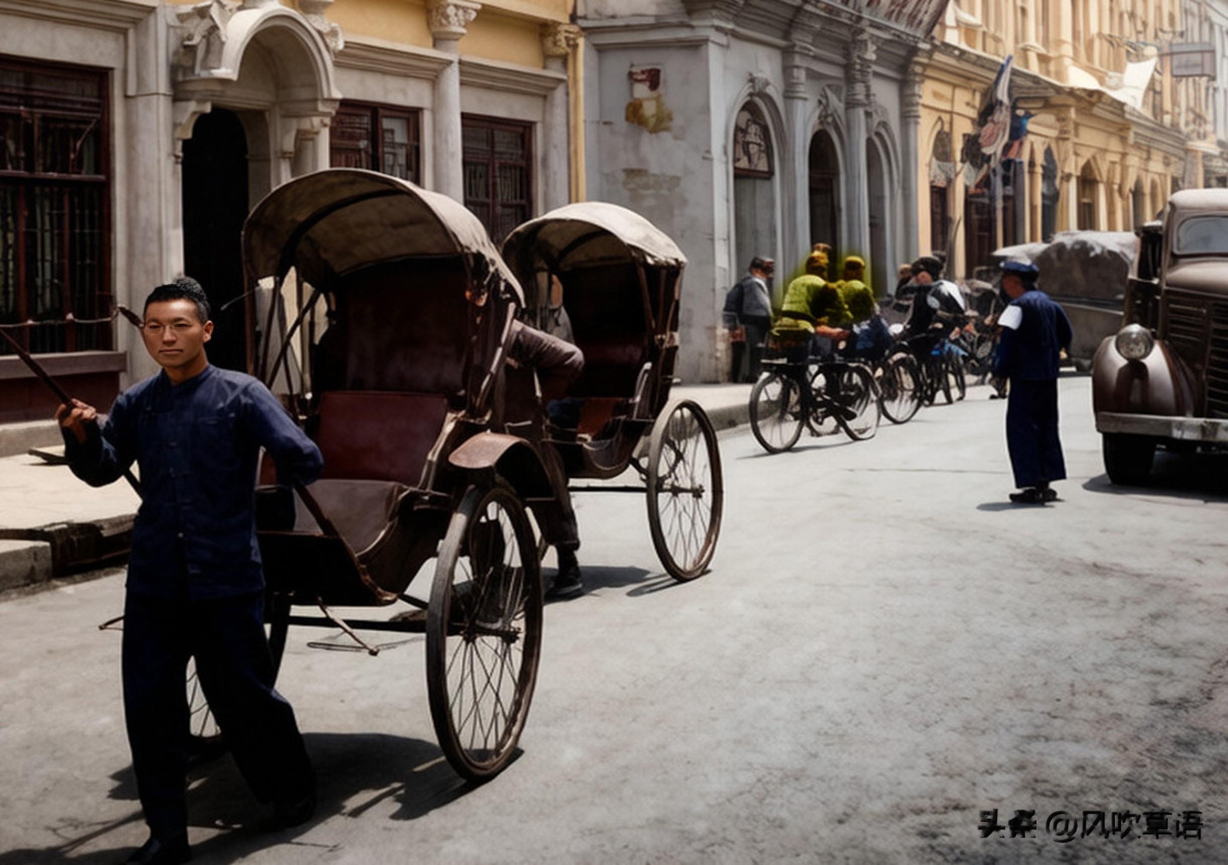 一名年轻的车夫正拉着人力车通过街道,远处有骑着自行车逛街的日本兵和一辆日本卡车,卡车旁边站着一个戴着白袖箍的男子,是帮日本人办事的亲日分子。