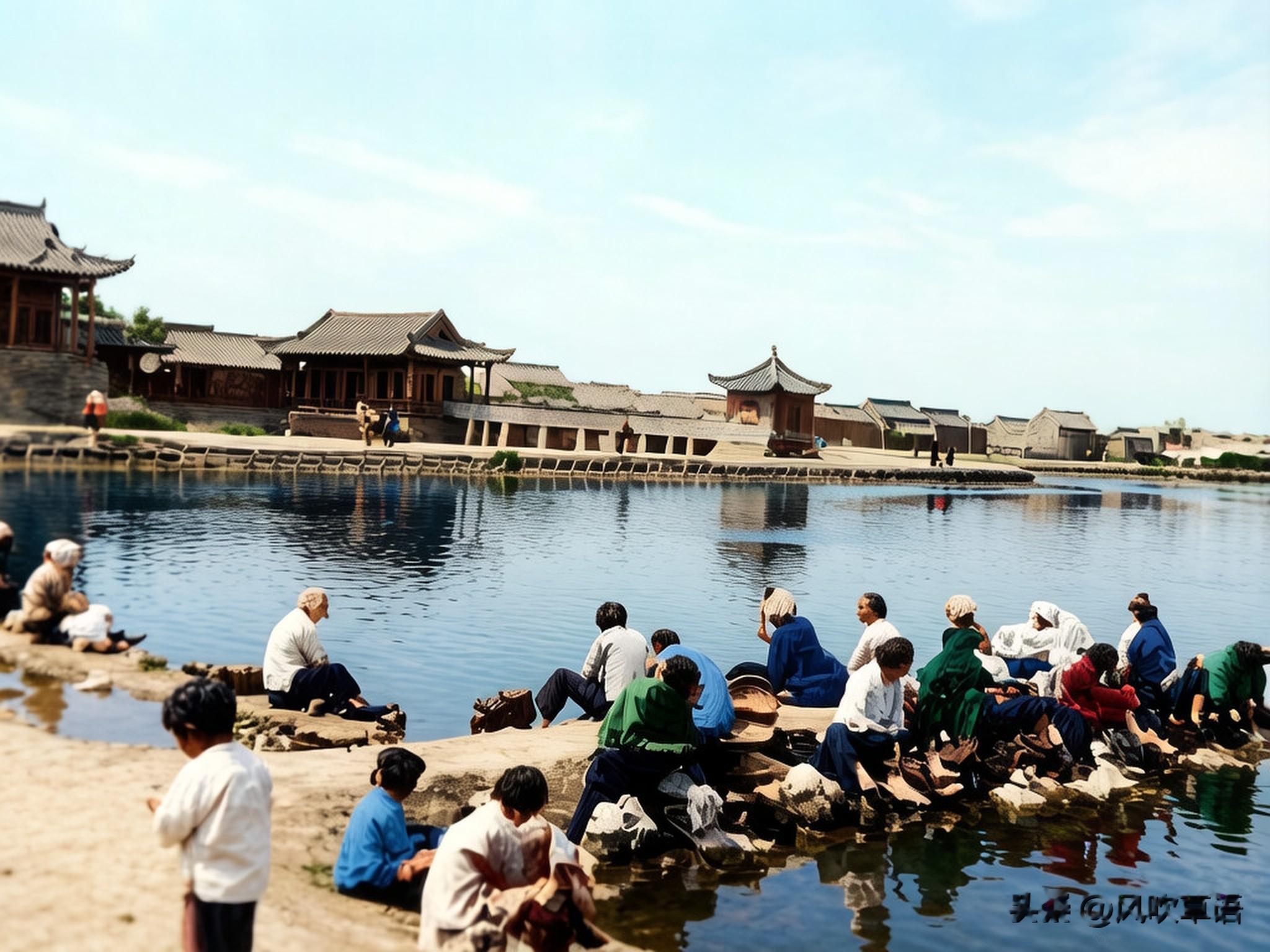 站在湖岸上远望高耸的龙亭。龙亭之下的湖边蹲着许多洗衣服的女子。龙亭为五代时的皇宫,宋太祖赵匡胤曾在此登基。1927年被辟为公园。