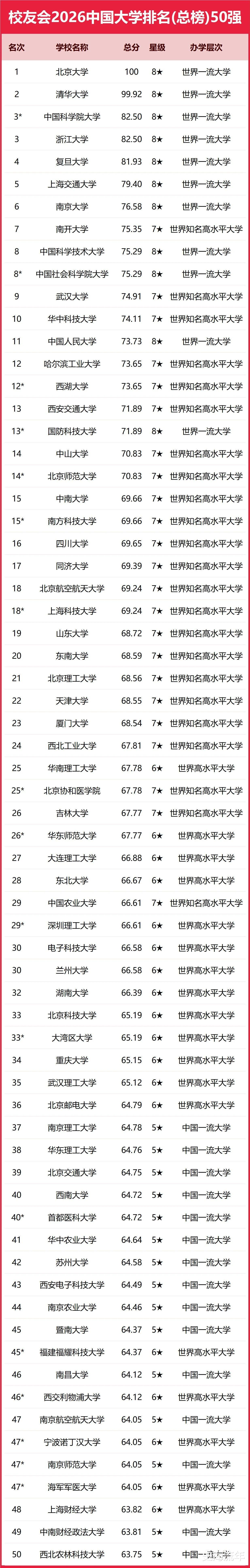 《校友会2026年中国大学排名》价值首先体现在为全社会提供了一个相对系统、全面的高校综合实力观察窗口,尤其注重高校的历史积淀、社会声誉和长期贡献,这与单纯以科研论文数量为导向的国际排名形成了有益互补。