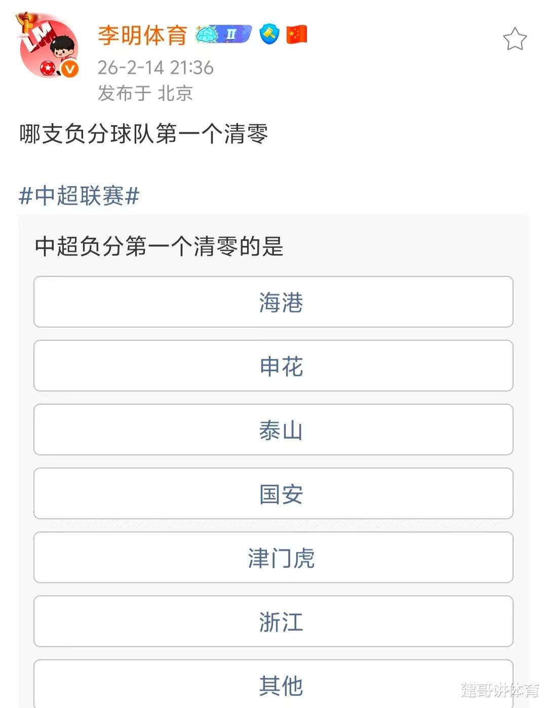 北京时间2月15日,在中超26赛季的赛程公布后,北京媒体人“李明体育”发布了一则消息,询问球迷哪支中超球队会成为新赛季第一支负分清零的球队,毕竟这个赛季负分起步的中超球队太多了,在海港、申花、国安、泰山、津门虎、海牛、浙江、河南、三镇都是负分的情况下,感觉北京媒体的这次询问,也给了球迷很多想象的空间。