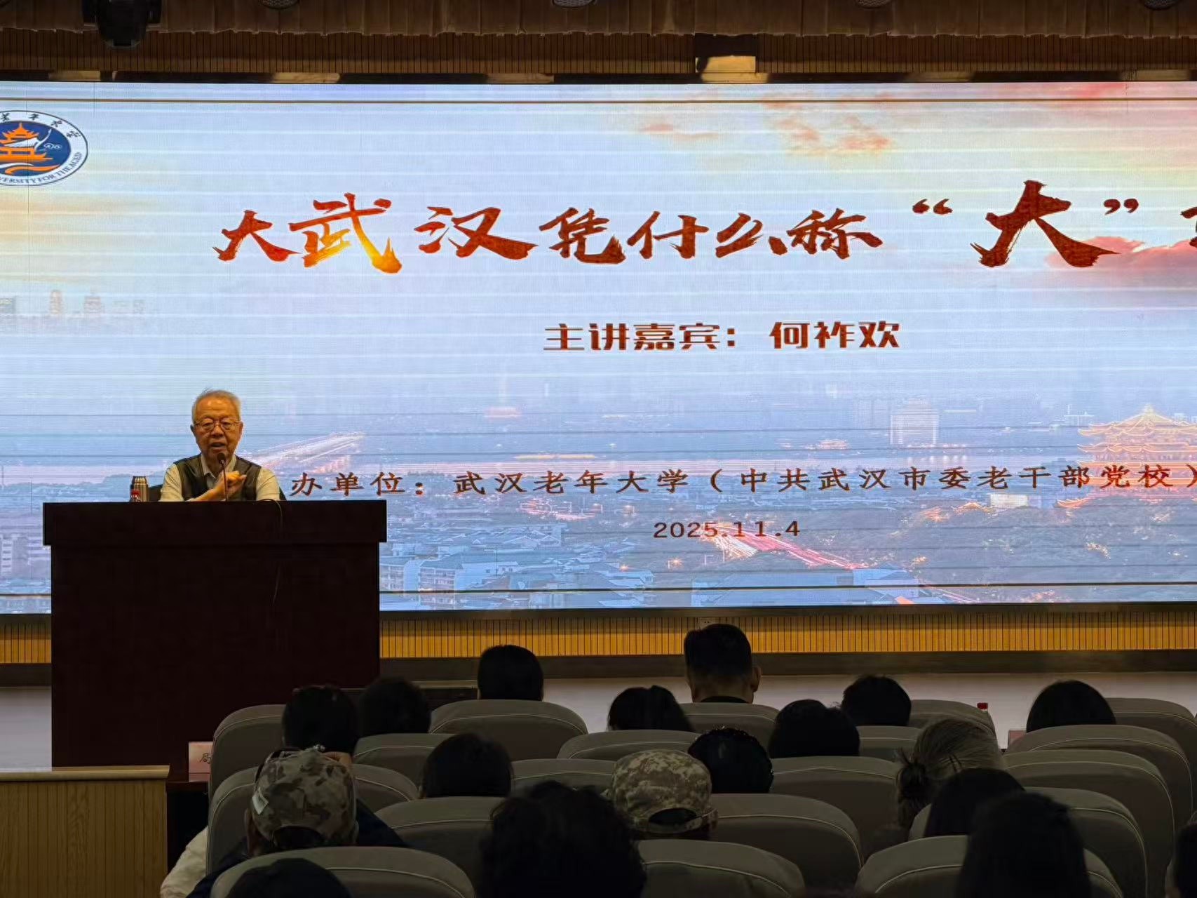 “紧走慢走,一天走不出汉口”。11月4日上午9时,武汉老年大学香江校区报告厅内座无虚席,84岁的著名表演艺术家何祚欢以一句地道的武汉话开场,瞬间拉近了与200余名师生的距离。