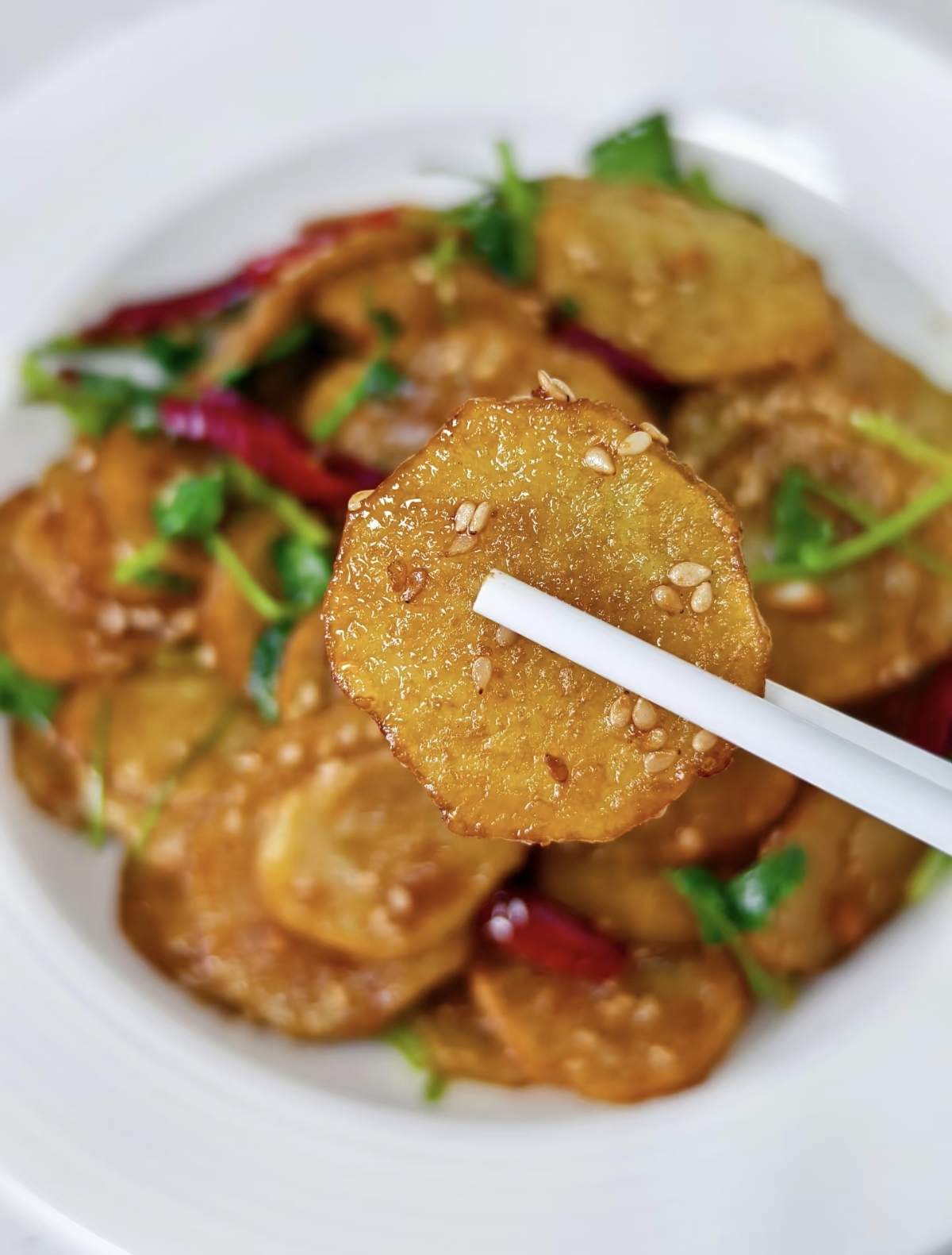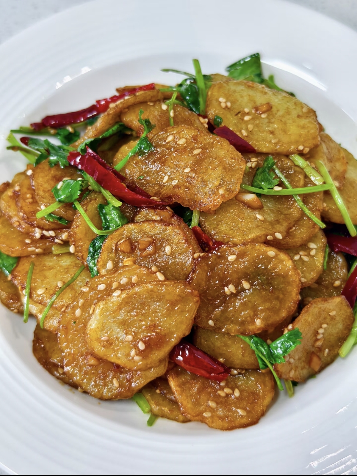 刚出锅的干锅土豆片最是诱人,土豆片边缘微微卷起,颜色金黄中透着红亮,上面撒着点点芝麻般的孜然,光是看着就让人食指大动。夹一片放进嘴里,先是感受到外皮的焦脆,紧接着是内里粉粉糯糯的口感,香辣的味道层层递进,越吃越上瘾。这道菜做法简单,味道却一点也不将就,无论是配米饭还是当追剧小零食,都再合适不过。在这个除夕夜,不妨试试这道一口沦陷的干锅土豆片,让简单的食材也能带来满满的幸福感,温暖你的胃,也点亮你的餐桌。