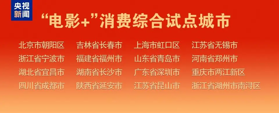 启动仪式现场公布了全国16个“电影+”消费综合试点城市名单,分别为江苏省无锡市、河南省郑州市、重庆市两江新区、浙江省湖州市南浔区、陕西省延安市、湖南省长沙市、福建省福州市、吉林省长春市、四川省成都市、湖北省宜昌市、浙江省宁波市、北京市朝阳区、上海市虹口区、山东省青岛市、广东省深圳市、江苏省昆山市。