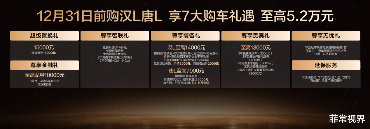 此次,汉L EV 3款车型,超级置换补贴后售价20.48万~26.48万元;汉L DM 3款车型,超级置换补贴后售价19.48万~24.48万元;唐L EV 3款车型,超级置换补贴后售价22.48万~27.48万元;唐L DM 3款车型,超级置换补贴后售价21.48万~27.08万元。同时,比亚迪还为用户准备了包含置换补贴在内的至高价值5.2万元(汉L)/4.5万元(唐L)尊享礼遇。(以上权益截至12月31日)