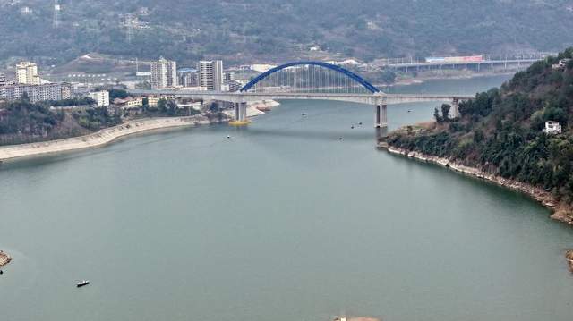 车行十多分钟,我们来到澎溪河大桥下。停好车,放飞无人机,鸟瞰高水位的澎溪河,暖阳下,澎溪河如镜面般铺开,平湖风光一览无余。