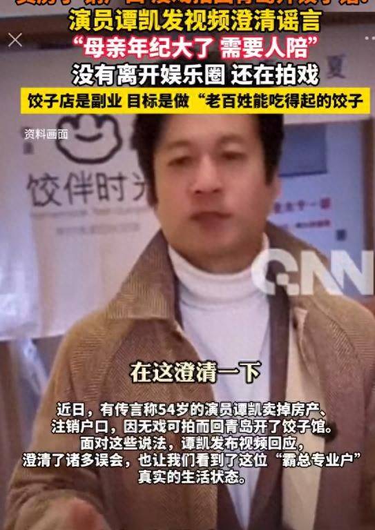 近日,一则关于演员谭凯“卖掉北京房产、注销户口,因无戏可拍被迫回青岛开饺子馆”的消息在网络流传,迅速引发对其演艺事业与个人境况的猜测。2月19日,谭凯本人发布视频直面争议,清晰驳斥了系列不实传言,并道出生活重心转移的背后原因,并非事业落魄,而是为陪伴年事已高的母亲。