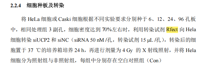 吉林大学研究者在 UCP2 对人宫颈癌细胞辐射敏感性的影响及线粒体相关机制的研究中,为明确 UCP2 的功能及调控机制,用 RFect siRNA转染试剂成功将 UCP2及阴性对照 siRNA 转染至人宫颈癌细胞 HeLa中。Q-PCR检测发现,相较于对照组,HeLa 细胞中 UCP2 的 mRNA水平显著降低,敲降效率约90%,同时WB结果表明,该基因在蛋白水平上下调明显。