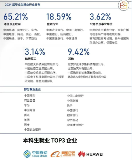 北邮的AI培养始终紧扣国家战略与产业需求,让学生既能站稳市场赛道,也能扛起国家赛道的重任:超65%的毕业生进入阿里、华为、字节跳动等通信及互联网头部企业,成为大模型研发、智能应用落地的核心力量,校友曾旺丁更是深度参与DeepSeek大模型研发,成为行业新锐,百万年薪早已是不少优秀学子的职业标配;还有部分毕业生投身航天军工、政务事业单位,为国家人工智能基础设施建设、国防科技发展贡献力量。