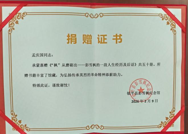 由河南省抗战英烈(彭雪枫)研究会副会长、河南省华夏文化艺术院秘书长孟庆国编著的《“枫”从磨砺出——彭雪枫的一段人生经历及后话》一书捐赠仪式与研讨会,于2026年2月9日在河南南阳市镇平县彭雪枫纪念馆与县委党校分别举行。