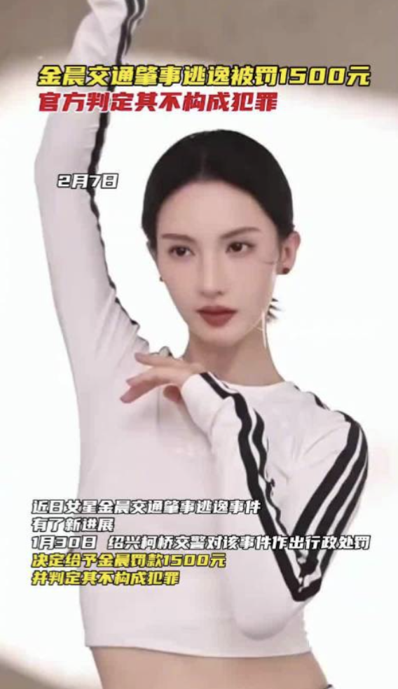近日,女星金晨交通肇事逃逸事件迎来新进展,引发全网持续关注。据浙江政务服务网公开信息显示,1月30日,绍兴市公安局柯桥区分局交通警察大队对该事件作出正式行政处罚决定,认定金晨实施造成致人轻微伤或者财产损失的交通事故后逃逸行为,依法给予其1500元罚款处罚,同时明确判定该行为尚不构成犯罪,相关处罚依据、违法事实均同步公示,此前网传的“顶包”“骗保”等疑问也随之有了明确答案。