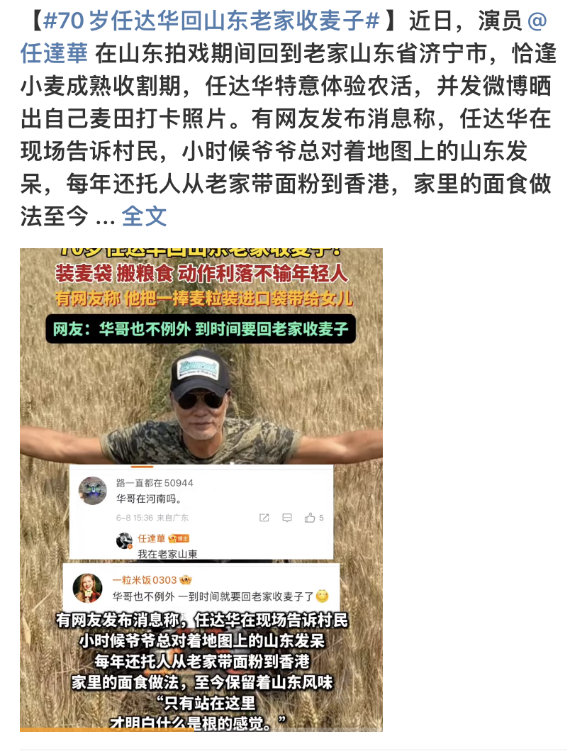 当网友镜头下的任达华戴着草帽、踩着胶鞋出现在济宁市郊的麦田时,这片土地上的时光仿佛被按下了慢放键。他熟练地抓起麦秆、利落地装袋,动作间透出老农般的娴熟,让人忘记他其实是香港影坛的传奇人物。更让人动容的是他透露的细节:爷爷对着地图凝视故乡的沉默,每年托人带回的面粉,家中延续的山东面食古法......这些细碎的往事,像麦粒般沉淀在家族记忆的深处。