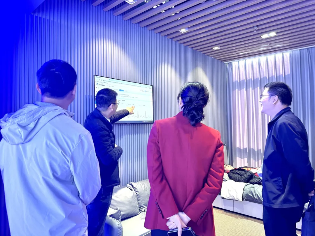 考察组一行参观了旷时科技展厅,了解公司发展、产品方案、技术优势等,详细了解旷时的芯片、整机及AIOT物联网平台,重点了解毫米波雷达产品技术在智慧康养领域的应用,并现场观看智慧康养场景演示。
