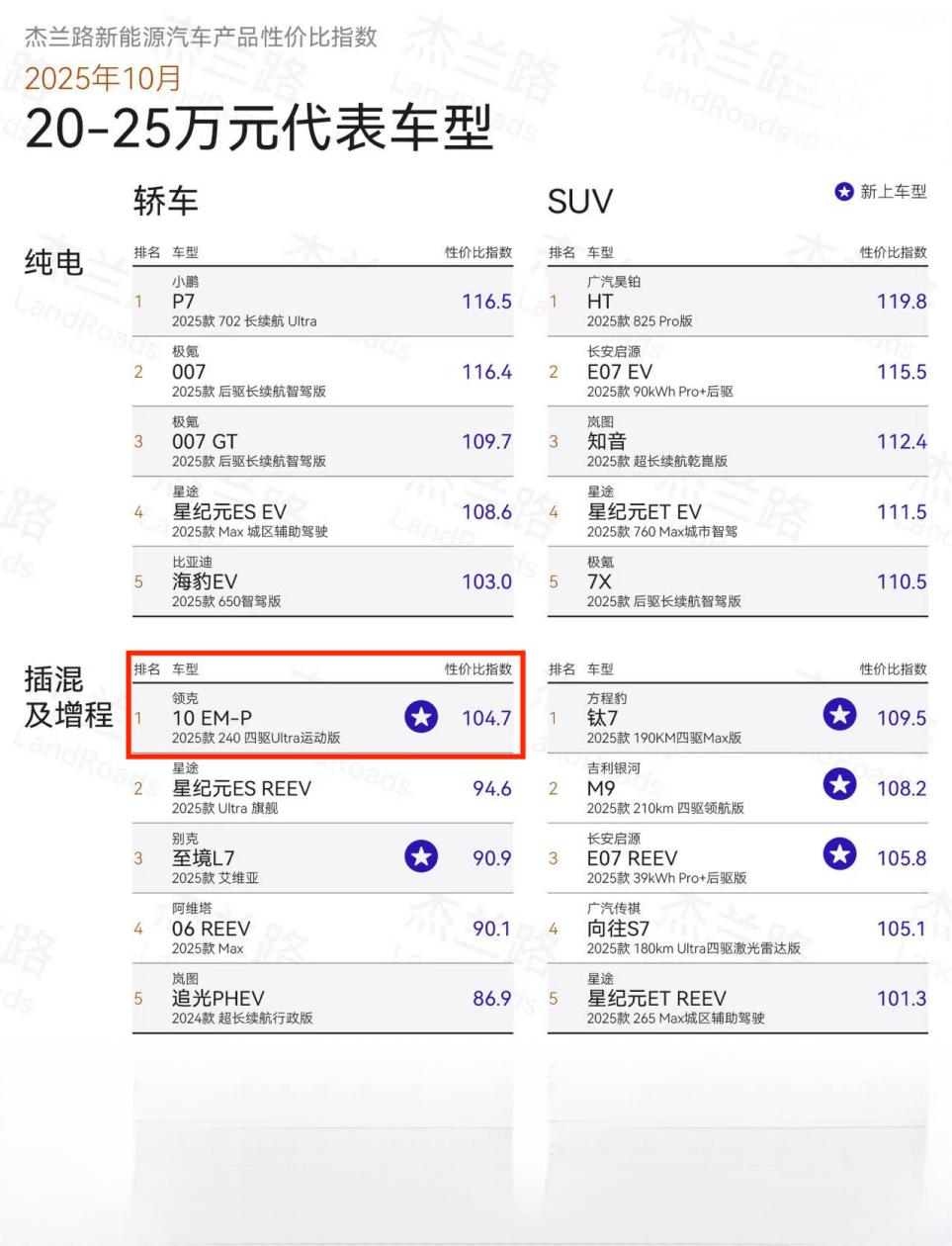 在繁忙的都市生活中,选择一辆合适的座驾往往需要权衡多方因素。当消费者面对20-25万预算区间时,领克10 EM-P在杰兰路最新榜单中的出色表现提供了有价值的参考。该车型在插电混动细分市场中获得首位排名,2025年9月5077台的月销量数据印证了其市场认可度。这个成绩背后反映的是消费者对车辆综合实力的理性判断,特别是在城市多场景用车需求下的精准定位。
