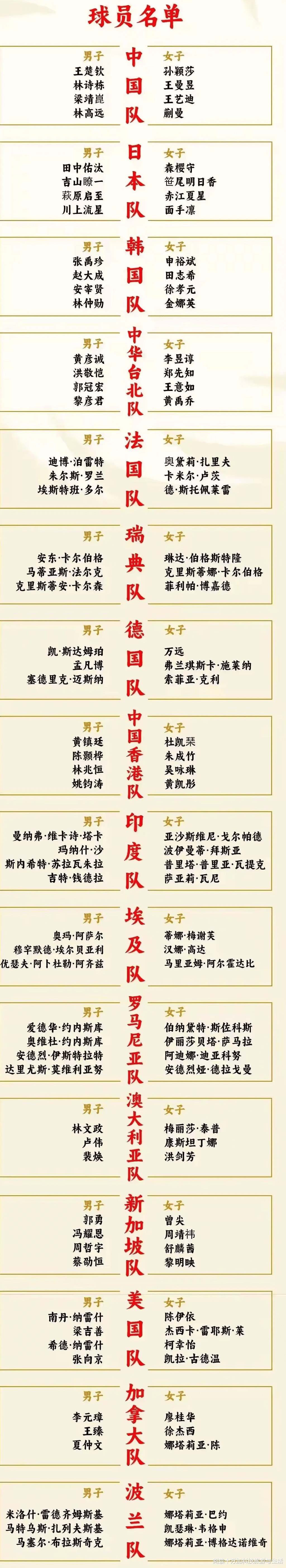 国乒名单: