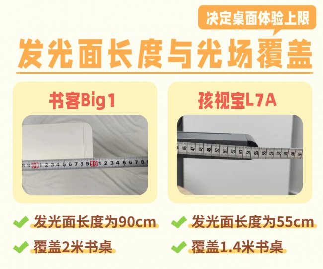 孩视宝L7A采用的是约55cm的长条灯罩,在同级产品中属于中上水平,能够覆盖常规1.2-1.4米书桌的核心学习区域。但当桌面较大、或者学习用品铺得比较开时,边缘区域的亮度衰减会更明显一些。