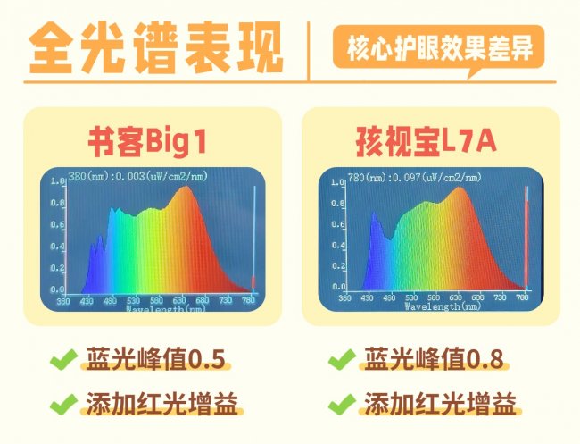 从光谱健康性的角度来看,两者都合格,但书客Big1在“为长时间用眼服务”这一点上,明显做得更深入。