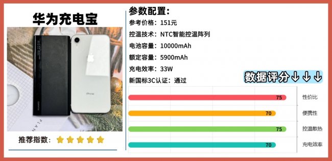 9:华为充电宝 综合评分:78+充电效率:★ ★ ★ ★安全性:★ ★ ★电池容量10000mAh,实测下来大概能给手机充 1~2次,平时通勤或者短途出行完全够用,不会有电量焦虑。支持 PD、QC、SCP、FCP 等常见快充协议,安卓手机、平板,甚至部分轻薄笔记本都能用快充,兼容性算是很全面了。配备 USB-A和 USB-C两个常用接口,可以同时给多台设备充电,出门带一块就够,不用再准备一堆线和充电头。