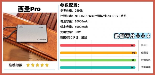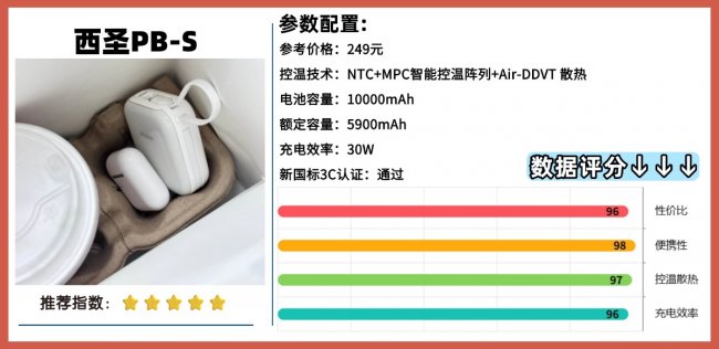 二:详细分析,2026年十大热门产品推荐1:西圣PBS半固态充电宝 综合评分:97+充电效率:★ ★ ★ ★ ★安全性:★ ★ ★ ★ ★西圣PBS这款充电宝在一百多的价位能够媲美千元机型的充电宝,在电池容量上这一款充电宝是完全够用的,拥有10000mAh电池容量,额定容量高达6600mAh,在满电的情况下能够充满2-3次,充电次数比我之前用的充电宝都多,更关键的是它用的是半固态电芯,和传统液态电池相比,稳定性更高,对高温、低温和物理冲击的耐受度更好。它支持 22.5W快充,而且兼容主流快充协议PD3.0和QC3.0双向快充,给手机补电的时候确实有明显感觉,电量从1%充满只需要1个小时不到,不像老款 5W那种慢慢的充电。