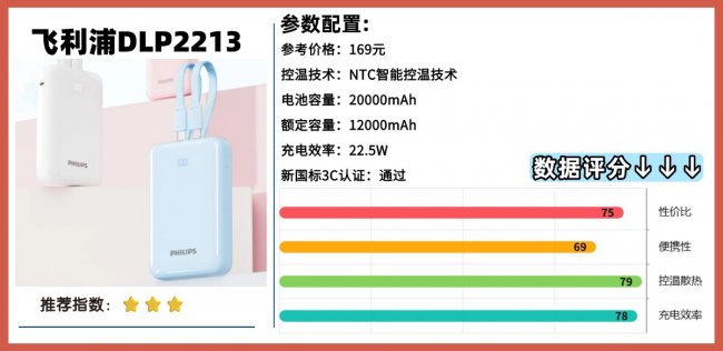 5:飞-利浦DLP2241B/93充电宝 综合评分:88+充电效率:★ ★ ★安全性:★ ★ ★这款飞利浦充电宝,外观挺小巧的,尺寸 106×66×30mm,放包里不占地方。重量 322g,搭配 20000mAh 容量,日常出门携带还算可以,就是厚度偏厚一点,单手拿久了会有点硌手。