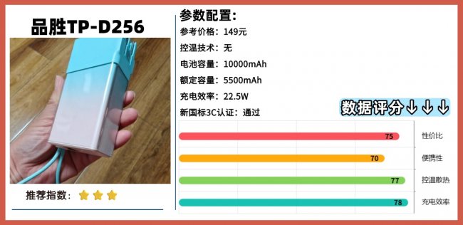 10:品-胜TS-D389充电宝 综合评分:76+充电效率:★ ★ ★安全性:★ ★ ★