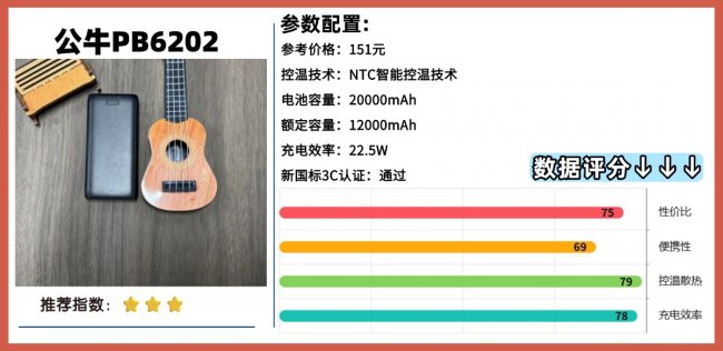 6:公-牛PB6202充电宝 综合评分:79+充电效率:★ ★ ★ ★安全性:★ ★ ★这款公牛充电宝标称最高22.5W 快充,实际使用时,充电速度比普通慢充要快一些,日常给手机补电不用等太久。连接设备后,机身上的闪电标志LED 灯会亮起来,能直观知道快充功能已经开启。它标注的电池容量是20000mAh,额定容量大概10240mAh,这个容量在充电宝里不算小的。平时日常出行、短途旅行用着完全够,就算要同时给两部设备充电,也能支撑一段时间。机身侧边设计了三个输出接口,两个USB-A和一个USB-C,接口数量不算少。平时给安卓手机、苹果设备或者其他小型数码产品充电都能兼顾7:小米1007Z充电宝 综合评分:84+充电效率:★ ★ ★安全性:★ ★ ★这款小米充电宝最方便的就是自带C口线,直接拉出来就能给小米手机充电,充电速度挺快的,支持33W快充。除了自带线,它还支持磁吸充电,13N的吸力挺够的,裸机吸得牢,带普通手机壳的话就得加个磁吸环。磁吸充电速度是7.5W,临时给iPhone补电完全够用。